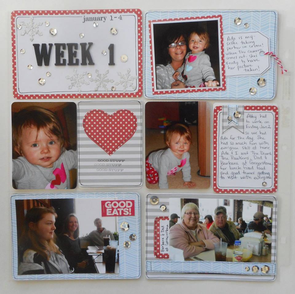 That makes Maven Lori's card and page a perfect fit for today! She created a weekly title page using snowflakes and sequins. That black is so striking on the white along with the little red polka dot.